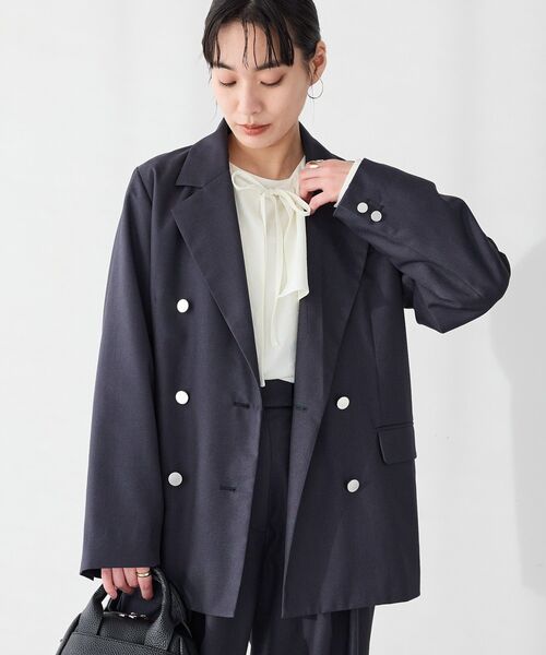 <大切な日を彩る。ハレの日服 ー Ceremony Collection> *品よく決まるダブルテーラードジャケット。大人のデイリーに寄り添う一着。 【素材・着心地】 ポリエステルとレーヨンの混紡生地を使用し、ほどよい厚みと滑らかな落ち感が特徴です。 裏地付きで着脱がスムーズ、透け感はなくデイリーに扱いやすい仕上がり。 伸縮性はないものの、ゆったりとした身幅でニットや重ね着にもストレスがありません。 季節の変わり目から冬のインナーレイヤーまで幅広く対応します。 【デザイン・シルエット】 端正なダブルブレストの顔立ちにメタルボタンがアクセント。 肩線はややゆとりのあるボクシーなシルエットで、ヒップにかかる着丈はバランスよく着回せます。 フロントポケットや背面の切替など、きちんと感を保ちながらも抜け感を演出できるデザインです。 【スタイリング】 通勤のオフィスカジュアルにはセットアップのスラックスやタックパンツと合わせてきれいめに。 休日コーデはデニムにスニーカーでカジュアルダウン、またはワイドパンツとローファーで落ち着いた休日コーデに。 インナーは軽いニットやブラウスを選べば秋の立ち上がりから冬コーデまで着回し可能。 色はネイビーやベージュが合わせやすく、アクセは小ぶりなゴールドで品よくまとめるとバランスが整います。 透け感[なし] 生地の厚さ[普通] 光沢感[なし] 伸縮性[なし] 裏地[あり] ポケット[あり] モデル身長164cm 着用サイズF ※モデル着用画像は、光の当たり具合で色味が違って見える場合がございます。 ※お使いのモニター環境によって商品の色味が違って見える場合がございます。  ̄ ̄ ̄ ̄ ̄ ̄ ̄ ̄ ̄ ̄ ̄ ̄ ̄ ̄ ̄ ̄ ̄ ̄ ̄ ▼商品のお気に入り登録がおすすめです ▼ 商品ページ内のハートマークをクリック。完売時の再入荷や、最後の1点の通知、最後の1点など、お得なお値下げ情報を受けとる事ができます。 【お知らせ】ページでも通知が確認できます。  ̄ ̄ ̄ ̄ ̄ ̄ ̄ ̄ ̄ ̄ ̄ ̄ ̄ ̄ ̄ ̄ ̄ ̄ ̄