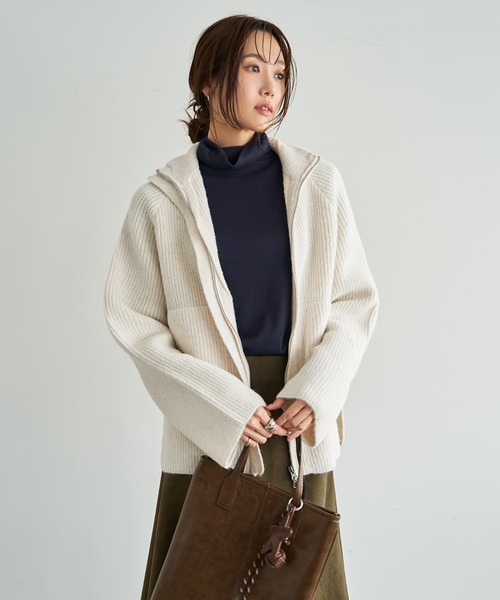 カーディガンよりも暖かくて今っぽい 人気のダブルファスナーを使用した、 キレイめカジュアルな羽織りトップス 少し太めの糸で編み目が見えるように編んだ、キレイめカジュアルなニットジャケット。中厚地ですが厚ぼったい感じは無く、この上に難なくコートが着れる実用的な厚み感です。 カーディガンよりは暖かく、甘さの無い印象で着れるのがこのジャケットの特徴。スカートにもパンツにも合うのはもちろん、ワンピースやサロペット、ジャンパースカートにも合う汎用性の高い羽織りアイテムになっています。 ◆ファスナーの閉め加減で、スタンドネックとオープンネックを好きな感じに楽しめます。 ◆ファスナーは人気のダブルファスナータイプ。上下から好きなバランスで開け閉めができて、着こなしを作るのに便利です。 ◆ファスナーは前立てで隠した比翼型。金具が目立ち過ぎずにスッキリと大人っぽい印象になります。 ◆コーディネート次第でキレイめにもカジュアルにもなるデザイン。日常シーンにも可愛いですし、オフィスで着ていても素敵です。 ◆袖口はリブでキュッと締めずに、袖幅をそのまま終わらせた今っぽいデザイン。袖丈も邪魔にならない程度に長く、さりげないトレンド感が洗練された印象を作ります。 ◆ボディサイドには長めのスリットでヌケ感をプラス。ファスナーをしっかりと閉めて着たときも、重たい印象になりません。 ◆暖かさ:裏起毛パーカーや軽いブルゾンと同程度。カーディガンよりは暖かく、コートの下に着ていれば格段に暖かくなるのは間違いありません。 ◆サイズ感:スウェットの上からでも着れるくらいのゆったり感。ただしオーバーサイズではなく厚ぼったい生地でもないため、身体が大きなシルエットになることはありません。 ◆肌触り:柔らかさとふんわり感、サラっとしたドライ感、ハリ感と弾力性などの全てが共存した着やすい質感。 ◆毛抜け・毛飛び:毛が抜けるタイプの素材ではありません。 【その他の仕様】 ◆着用時期:10-4月頃が目安 ◆サイズ感:ゆったりめのサイズ感 ◆丈感:ヒップのほとんどが隠れる程度 ◆シルエット:ストレート ◆首元:スタンドネック/オープンネック ◆肩幅:問わないタイプ ◆アームホール:広め ◆袖幅:広め ◆袖丈:長袖 ◆袖口:何もなし ◆厚み:普通-やや厚手 ◆柔らかさ:柔らかさの中にハリ感が共存 ◆肌触り:サラッとしつつ弾力がある感じ ◆着用ジワ:できにくい ◆毛羽立ち:できにくい ◆伸縮性:あり ◆光沢感:なし ◆透け感:なし ◆スリット:両サイドにあり(19cm程度) ◆着脱:フロントダブルファスナー ◆ファスナーの色:シルバー(光沢あり) ◆ポケット:フロント左右にあり ◆裏地:なし ◆手洗い:可能 ◆アイロン:不要 ◆スチーマー:使用OK 【お色について】 ◆ピンク:鮮やかなピンクに冬でも浮かない絶妙な深みを入れたキレイな発色。マゼンダやフューシャのような紫色系の色素は無く、純粋にピンク系のお色です。少しだけ白っぽい糸を混ぜることで、のっぺりとしない立体感を加えています。 ◆グレー:ミドルグレー、ライトグレー、白の3色を使用したメランジ編みのグレー。冬のグレーとしてはやや明るめで、ミドルグレーとライトグレーの中間くらいの明るさなので春先も軽アウターとして使いやすくなっています。 ◆アイボリー:真っ白ではなく、少しこっくりとした深みのあるニュアンスホワイト。イエロー味などはなく、白が深い感じのお色味感です。