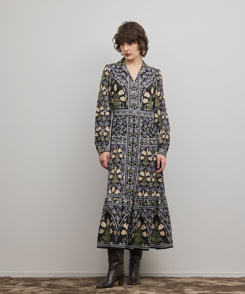 繊細ながらダイナミックなフラワー柄で魅せる、大人のフラワープリントドレス。 歩いた時に優しい揺らぎがでる、落ち感のよい上質なパウダーデシン素材を使用。 そこにオーナメント柄にはめ込んだ春を感じさせるオリジナルチューリップモチーフをのせた、どの角度から見ても映える華やかなデザインがポイントです。 フロントの前開きに合わせた流れるような柄の入り方や、ウエスト・カフス・裾のラインに合わせた細かな柄感など、ワンピースの型に合わせて柄を起こす贅沢なパターンプリントならではの美しいデザインや佇まいが魅力。 程よいフィット&フレアシルエットを意識しながらもあまり絞りすぎず、胸下切替えを入れてデイリーに着こなしやすく仕上げたのもポイント。 衿元はあえてイタリアンカラーを採用し、クラシカルな雰囲気がありながら程よい抜け感のある表情が、穏やかで優しい季節に良く合います。 キナリはくすみピンクや青味のグリーンを入れて、春の気分を取り入れつつ優しさも感じる色合いに。 ブラックはラベンダーやベージュに寒色を織り交ぜて、シャープな華やかさを表現しました。 まだ寒さの残る時期はファーコートなどをさっと羽織って、暖かくなったら一枚で。 一足早い春の季節を感じる優しい色味やプリントがスタイリングをぐっと新鮮に見せてくれるアイテムです。 ※こちらのモデル着用画像はサンプル品を撮影しております。 実際の商品と仕様、加工、サイズが若干異なる場合がございます。予めご了承くださいませ。 洗濯表示 洗濯不可 漂白不可 タンブル乾燥不可 アイロンは120℃まで 弱いドライクリーニング(石油系)可