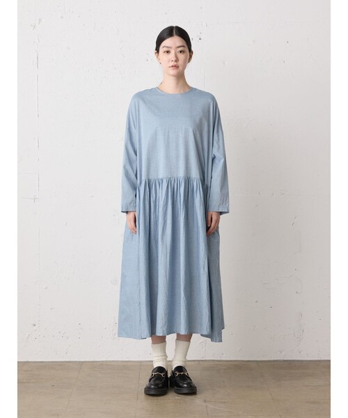 軽くてナチュラルな印象のシャンブレー素材を使用したシャンブレーギャザーワンピースです。生地をたっぷり使い、ボリューミーなワンピースに仕上げました。フンワリ感はあるものの、軽やかな雰囲気の女性らしい1枚です。バックネックにボタンが付いているので着脱のしやすいのもポイント。春のイメージですが、ニットと合わせウォーム感のあるアイテムと合わせた着こなしも素敵です。季節を長く愛用していただけるワンピースです。Point袖丈:長袖デザイン:無地ネック:クルーネックDetail裏地:なし透け感:なし伸縮性:なし光沢感:なしポケット:サイド※商品画像は、光の当たり具合やパソコンなどの閲覧環境により、実際の色味と異なって見える場合がございます。予めご了承ください。※商品の色味の目安は、商品単体の画像をご参照ください。こちらの商品 は MidiUmi にてお取り扱いしております。店舗在庫等については直接店舗にお問い合わせください。