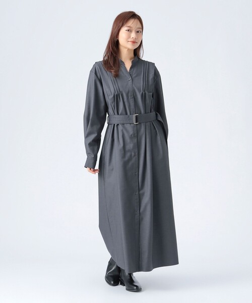 洗練された大人の佇まい ■デザイン マニッシュな雰囲気を醸し出す合繊のスーツ地を使用したワンピース。タックディテールを入れ、立体的なデザインがポイントです。胸元をすっきりとさせることで大人の抜け感を演出し、着こなしを格上げしてくれる1枚。 ■コーディネート 前を開け羽織りとしてはもちろん、シャツワンピースとして取り外し可能なベルトアクセントでスタイルアップ効果も◎。ハンサムな素材感で仕立てたワンピースなので、きちんとしたシーンにも対応できるアイテムです。 ■素材 ロングシーズン着用可能な素材も嬉しいポイント。 ■ケア方法 洗濯可(詳細は商品についている洗濯表示タグをご覧ください。) ※光の当たり具合やパソコンなどの閲覧環境によって実際の色味と異なって見える場合がございます。予めご了承ください。 ※商品の色味は商品単体で撮影した画像をご参照ください。