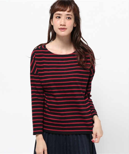 ●○ベーシックなボーダーTOPS○● ドロップショルダーボーダープルオーバーです。厚手の素材を使用しています。両型にマチを付けたボートネックがポイントです。ゆったりめの身頃ですが袖が細身なのですっきり着て頂けます。ボトムを選ばない万能アイテムです。