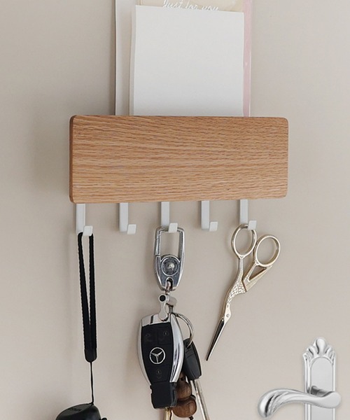 12D45-KR ウッドウォールフック 収納ホルダー 木目調のプレートとブラックフックを組み合わせた、シンプルで使いやすいウッドウォールフック。 玄関やリビング、キッチンなど、さまざまな空間に自然になじむデザインで、鍵やマスク、小物類をすっきり収納できます。 壁掛けタイプのため、省スペースで設置でき、生活動線を邪魔しないのもポイント。 フックは複数配置されており、アイテムごとに分けて掛けられるため、日常使いの整理整頓に便利です。 付属のネジでしっかり固定できるほか、壁面保護用のクッションパーツも付属しており、設置時のガタつきや壁への負担を軽減。 ナチュラルとブラウンの2カラー展開で、インテリアのテイストや好みに合わせて選べます。 機能性とデザイン性を兼ね備えた、毎日の暮らしに取り入れやすい収納アイテムです。 ⭐︎おすすめシーン ・玄関での鍵やマスクの定位置収納に・外出時にさっと取り出したい小物の整理用として・キッチン周りでエプロンやキッチンクロス掛けに・デスク周りやワークスペースの小物整理に・一人暮らしや新生活の収納アイテムとして ⭐︎コーディネート ナチュラルテイストのインテリアには、木目を活かした家具やファブリックと合わせることで、空間に統一感が生まれます。 玄関ではシンプルなシューズラックや観葉植物と組み合わせることで、生活感を抑えたすっきりとした印象に。 モダンやミニマルな空間には、ブラックフック部分をアクセントとして取り入れるのがおすすめ。 白壁やグレー系の壁面に設置すれば、ほどよく引き締まった雰囲気を演出できます。 北欧風や韓国インテリアとも相性が良く、淡色アイテムやウッド調の小物と組み合わせることで、やさしく落ち着いた空間づくりが可能。 実用性だけでなく、見せる収納としても活躍するアイテムです。 【Information】 ☆《お気に入り登録》でお得な情報がいっぱい☆ ・「商品のお気に入り登録」で再入荷通知や、ラストの通知、セール通知も受け取ることができます。 ・「ブランドのお気に入り登録」で新商品や再入荷など、お得な情報を受け取ることができます! ※ご注文いただいた予約商品のお届け時期の確認は、注文履歴ページより行えます。 ※他のキャンペーンにより、期間中に価格が変動する場合があります。 ※セールは予告なく終了させていただく場合もあります。
