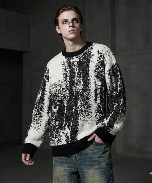 ■explanation大胆なモノトーンコントラストとアブストラクト柄が目を惹く、ジャガードデザインのニットセーター。ブラックとホワイトの二色を織り交ぜて表現された独自のパターンは、立体感と奥行きがあり、一枚で圧倒的な存在感を放つ仕上がりに。ストリート、モード、韓国系ファッションなど幅広いスタイリングに対応し、着るだけで雰囲気のあるコーデが完成する主役級アイテムです。シルエットはトレンドを押さえたワイド&ゆったり目のビッグシルエット。肩の落ち感や丸みのあるフォルムが抜け感を生み出し、ユニセックスで着やすいサイズバランスに設定されています。インナーにはTシャツを重ねたレイヤード、アウターにはレザー・ブルゾン・デニムジャケットなどとの相性も抜群。■detail・アブストラクト柄のジャガード織りが圧倒的存在感・ブラック×ホワイトのモノトーンで合わせやすい・トレンド感抜群のビッグシルエット・ユニセックスで男女問わず着用可能・1枚でスタイリングが完成する主役級デザイン・レザー・ブルゾン・デニムなどアウターとの相性◎・秋冬〜春まで長く活躍する程よい肉厚感【商品画像について】※画像はサンプルです。実際の商品と仕様、加工、サイズ、カラーが若干異なる場合がございます。また、撮影場所や照明の照射・角度、お使いのモニター環境によりお色味が異なる場合がございます。予めご了承ください。《お気に入り登録》・「商品のお気に入り登録」で再入荷通知や、ラスト1点の通知、セール通知も受け取ることができます。・「ブランドのお気に入り登録」で新商品や再入荷など、いち早くブランドのお得な情報を受け取ることができます。