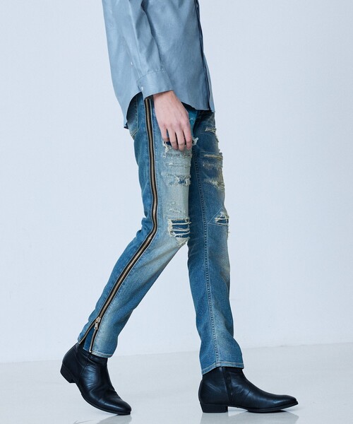 Side Zip Damage Skinny Denim【素材】伸縮性に優れた9オンスのストレッチデニム。細見のシルエットながらストレッチの効いた動き易さが特徴的。 【デザイン】定番5ポケットのスキニーパンツをベースに、存在感あるメタルジッパーを両サイドに走らせた唯一無二のデザイン。フロントにクラッシュ加工などハードなカスタムを施しました。【コーディネート】レザーやジャケットなどのモードスタイルから、Tシャツやシャツと合わせたカジュアルスタイルまで絵になります。同型ウォッシュドタイプ(品番:02520050052)もあり。
