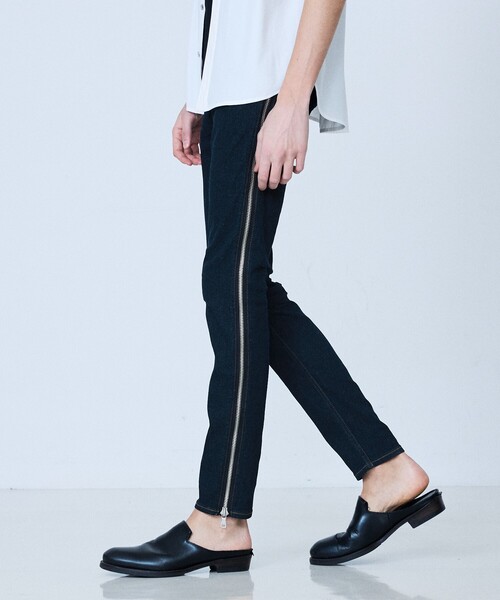 Side Zip Skinny Denim【素材】伸縮性に優れた9オンスのストレッチデニム。細見のシルエットながらストレッチの効いた動き易さが特徴的。 【デザイン】定番5ポケットのスキニーパンツをベースに、存在感あるメタルジッパーを両サイドに走らせた唯一無二のデザイン。ウォッシュドを施したきれいめな一本。経年劣化も楽しめます。【コーディネート】レザーやジャケットなどのモードスタイルから、Tシャツやシャツと合わせたカジュアルスタイルまで絵になります。同型ハードカスタムタイプ(品番:02520050051)もあり。
