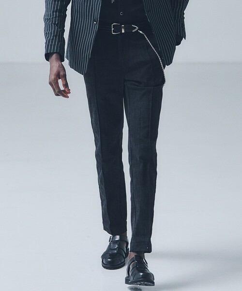 Tuck Tapered Denim Slacks【素材】初春を感じさせるミドルオンスで着心地の良さを考慮した伸縮性に優れた9オンスストレッチデニム。ウォッシュド加工を施し、程良くフェードさせて明るい表情に仕上げています。縦糸のランダムなムラ糸がデニムらしく、縦スジにフェードした表情が特徴のデニムです。 【デザイン】テーパードシルエットのスラックスタイプ。フロントにはセンタークリースを入れてキレイめにデザインされています。ウエストサイドギャザーが履き心地の良さを感じさせます。また、リベットでデザインされたオリジナルレザータグも特徴的。インディゴは配色グレーステッチでシックにデザインされています。【コーディネート】同素材ジャケット(品番:02520082077)、同素材シャツ(品番:02520010077)と合わせたセットアップスタイルがオススメ。※ウエスト後ろ部分の仕様はブラックが正(リベットでデザインされたオリジナルレザータグ付)になります。