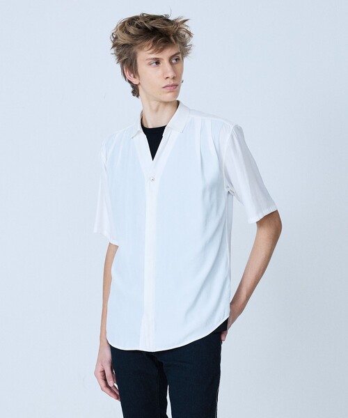 Skipper S/S Shirt【素材】独特なタッチで、シワような雰囲気が特徴のポリエステル素材を使用。軽い着心地です。 【デザイン】前シーズン好評だったデザインをブラッシュアップ。前後身頃に特徴的なタックを施しました。比翼仕様で閉じると1つ目のボタンがアクセントになるスキッパーシャツです。【コーディネート】インナーにはTシャツやタンクトップとのレイヤードがオススメ。パンツはデニムやスキニーなどの王道スタイルから、ワイドパンツなどのリラックス感を感じるスタイリングにも合います。