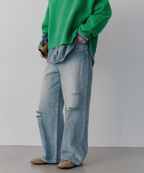 古着のような加工感と計算されたシルエットが融合した、大人のためのダメージデニムーーー★おすすめポイント★[1]耐久性と独特の色落ちが特徴[2]ぽてっとしたボリューム感[3]腰回りスッキリでスタイルが悪く見えないデザインーーー[fabric]アメリカの老舗デニム生地メーカーであるコーンミルズ社をルーツにもつデニムを使用。現在はコーンミルズ社ではなく、別のテキスタイルメーカーが技術を継承して製造しているものです。CONEデニムは耐久性と独特の色落ちが特徴で、長年着用することで美しい濃淡のフェード感が生まれ、立体的なヒゲやアタリが特徴的な経年変化を楽しみやすい生地。[design]14ozのCONEデニムを使用し、一度加工した後にさらに経年変化を感じさせるオーバーダイを施し、ヴィンテージのような深みのある色合いを実現。股上を深めに設定し、ぼてっとしたボリューム感がポイント。腰回りはすっきりと仕上げ、スタイルが悪く見えないパターン設計にもこだわったデニム。[styling]チュニック丈のトップスを合わせて、ルーズなシルエットの旬なバランスを楽しむのはもちろん、ハイウエストを活かしてインスタイルでメリハリをつけた着こなしも◎まだ肌寒い時期にはレースのタイツやカラータイツを履いて覗かせたスタイリングなどもおすすめ。※屋外での撮影画像は光の加減で実際の商品より明るく見えたり、風合いが異なって見える場合がございます。 商品の色味はスタジオ撮影の画像を参考にして下さい。-------------------------------------≪お買い物をよりお楽しみいただくために≫◆商品のお気に入り登録(ハートマークをクリック)完売カラーの再入荷通知や、完売間近の通知、セールの通知も受けることができます。◆ブランドのお気に入り登録新商品や再入荷など、いち早くブランドのお得な情報を受け取ることができます。-------------------------------------