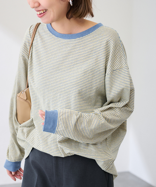 リサイクルコットン混のムラ糸を使用し、揺らぎのある独特な風合いを表現したランダムピッチのミジンボーダー柄が特徴のロンT。 シーズンムードを感じるカラーを取り入れ、ややジャストサイズ寄りのシルエットですっきりとした印象で着こなせます。 襟ぐりと袖口にはボーダーから一色を抜き出したリブを配し、カジュアルながらまとまりのある印象に。 ベーシックな着こなしをアップデートするアイテムです。 ********************** 透け感:なし 裏地:なし 伸縮性:あり 光沢感:なし 生地の厚さ:普通 ********************** ※取り扱いについては、商品についている品質表示でご確認ください。 ※こちらの商品は、FRAMeWORK での取り扱いになります。 直接店舗へお問い合わせの際は FRAMeWORK 店舗へお願い致します。 ※照明の関係により、実際よりも色味が違って見える場合があります。 またパソコン・スマートフォンなどの環境により、若干製品と画像のカラーが異なる場合もございます。 予めご了承の上ご注文ください。 ※商品の色味は、商品アップ画像をご参照ください。 本体:洗濯機洗い(弱)