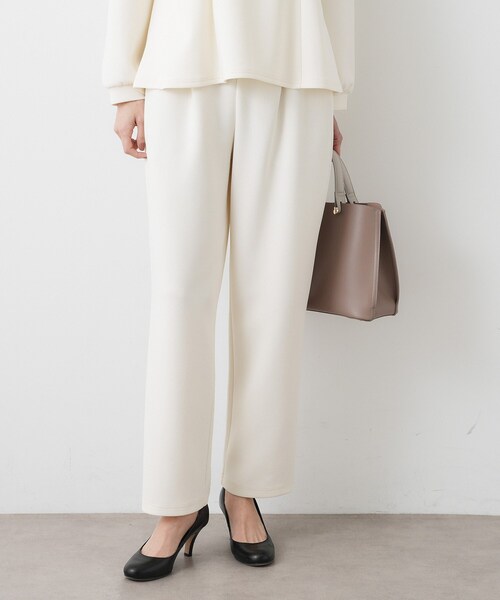 【デザインポイント】カットジョーゼットを使用したシルエットの美しさにこだわったパンツです。ハリ感のある素材が縦ラインを強調し、足をすらりと見せるラインが特徴。【スタイリングポイント】セットアップ可能なトップス(F58-85008)合わせがおすすめ。ニットやカットソーと合わせてデイリー使いも◎【素材ポイント】カットジョーゼット素材でお手入れ簡単できちんと見え。ストレッチ性が高く、長時間の着用も快適です。シワになりにくい素材が特徴です。【仕様】・ポケット数:横×2・ウエスト総ゴム・裏地なし※ホワイト(002)はやや透け感があります。※照明の関係により、実際よりも色味が違って見える場合があります。また、パソコン・スマートフォンなどの環境により、若干製品と画像のカラーが異なる場合もございます。モデル情報:身長168cm B76 W58 H86 着用サイズ:02(M)店舗へのお問い合わせ商品番号:F58-65004●製品寸法:01(S):W65cm H99cm 股下65cm 前股上30cm 渡り幅31cm 裾幅18cm 総丈94cm02(M):W68cm H102cm 股下67cm 前股上30cm 渡り幅32cm 裾幅19cm 総丈96cm03(L):W71cm H105cm 股下68cm 前股上31cm 渡り幅33cm 裾幅20cm 総丈98cm備考: