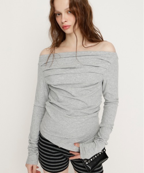 ■POINT デコルテを綺麗に見せてくれるオフショルダートップス。 綺麗目なデザインですがカットソーを使用しているのでカジュアルさもプラス。 フロントに大胆に施したタックのドレープデザインが一枚で着映えするアイテムです。 スタイリングによってオンショルダーやワンショルダーとしても楽しんでいただけます。 ■DETAIL 程よいフィット感のあるシルエットながら、柔らかく伸縮性のあるベアフライス素材を使用しているのでストレスフリーな着心地も魅力。 裾のアシンメトリーデザインはアウトスタイルでもこなれ感の出るアイテムです。 ■STYLING ボトムスにインアウトどちらでもバランスの取りやすいデザインなので王道のデニム合わせはもちろん、ロングスカートで上品なスタイリングまで幅広いスタイリングを楽しんで頂けます。 アウターやジャケットのインナーに使用出来るのでロングシーズンで活躍するアイテムです。 ■FABRIC/MATERIAL 柔らかく伸縮性のあるベアフライス素材を使用。 ■透け感:なし ■光沢感:ややあり ■伸縮性:あり ■裏 地:なし ※お取り扱い上のご注意 ・本品は素材の特性上色落ちします。 ・洗濯、クリーニング、着用(使用)時に他の衣類や雑貨、家具類に色移りする事があります。 ・特に汗や雨等で湿った状態では、色落ちが顕著になります。 ・白、淡色との組み合わせは避け、お取り扱いには十分ご注意下さい。 [注意事項] ※画像の商品はサンプルです。実際の商品と仕様、加工が若干異なる場合があります。 ※画像の商品は光の照射や角度、お使いのモニター環境により、実物と色味が異なる場合がございます。 ※着用、お取り扱いの際は、アテンションタグをご確認ください。 ※一部予約商品につきましては生産上の都合によりお届け予定日や店頭発売と前後する場合もございます。 ※追加生産商品は、一部の店舗、通販で販売中の場合がございます。予めご了承下さい。 【SLY/スライ】 「Casual」「Girly」「Mode」をベースに発信する、ディテールへのこだわりが詰まった、どこか必ず女性らしさを感じるアーバンスタイル。 さまざまなエッセンスをミックスした、時代の空気を体現するコレクションを展開。 ▼商品のお気に入り登録 お気に入りアイテムの値下げ・再入荷・在庫1点などの通知を受け取ることができます。 ▼ブランドのお気に入り 登録新商品や再入荷、セール、クーポン配布などお得な情報を受け取ることができます。 ※こちらの商品はSLY独自の採寸方法となっています。本サイトのサイズガイドと採寸方法が異なる場合がありますのでご了承ください。