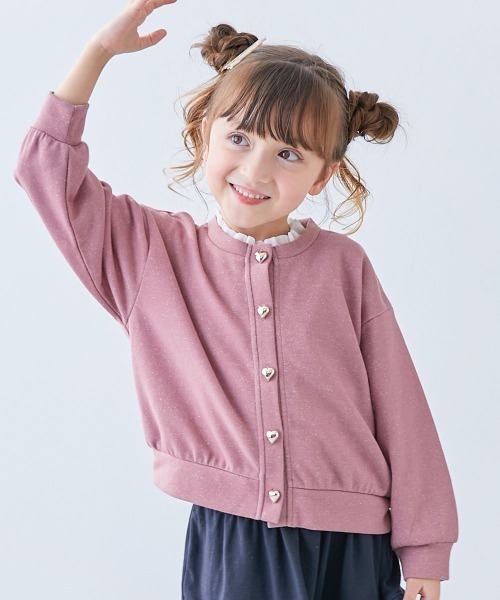 ハートのボタンと、きらっと光るラメがかわいいカーディガン。さっと羽織れて、季節の変わり目におすすめのアイテムです。落ち着いたカラーは、発表会やお食事会などフォーマルシーンで着用しても〇■素材ラメが散りばめられた裏毛素材表面にちらちらと光るラメが特徴的な素材。ふんわりと柔らかな風合いです伸縮性:ふつう■スタイリングシンプルな着こなしにぱっと羽織るだけでおしゃれになれるアイテム。デニムを合わせてカジュアルに着こなすもよし。スカッツを合わせたガーリーなコーディネートもおすすめです。■アピールワード羽織り カーデ カーディガン トップス■洗濯方法洗濯機洗い可(デリケート洗い) / 漂白剤使用不可 / 乾燥機使用不可 / 日陰つり干し/ 洗濯ネット使用■ご注意事項・素材の特性上、毛玉が生じる場合があります。毛玉が発生した場合は、毛玉取り器やはさみで丁寧にカットしてください。・摩擦や水、汗などで色が移ることがあります。ご注意ください。・平置きにて採寸しているため、サイズや形に多少の誤差が生じる場合があります。あらかじめご了承ください。・生産時期により、多少色味が異なる場合がございますが、素材・サイズ等の品質に違いはございません。・ご使用のパソコンやブラウザの環境により、実際の色とは多少異なる場合がございます。ー devirockについて ー子育てがもっと楽しくなる社会を目指し、親と子が感じる課題を解決する""新しいあたり前""を提案しています。男の子・女の子のデイリーウェアを中心にラインナップ。ベーシックからトレンドまで幅広いデザインと、ベビーからキッズまでの豊富なサイズ展開が魅力の子供服ブランドです。