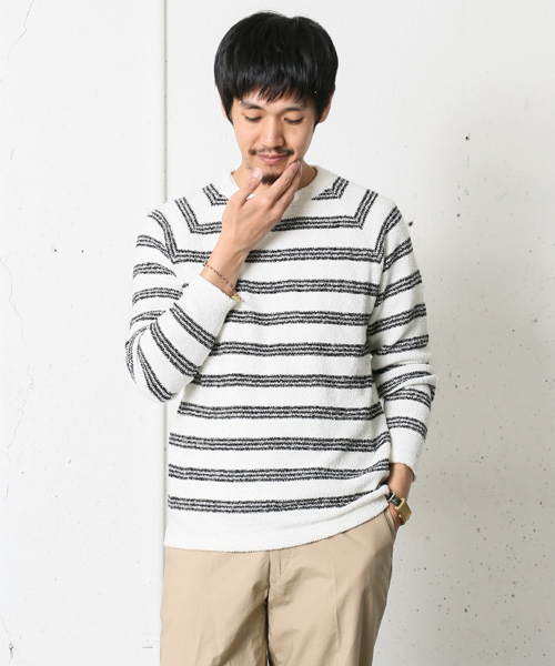 今季トレンドのブークレ糸を使用したラグランスリーブのボーダーニットです。 2色の糸を撚り杢調に仕上げています。 柔らかな肌触りが気持よく、今からの季節では重宝する1枚です。 店舗にてお問い合わせの際は、下記の品番をお申し付け下さい。 品番:DR52-12H015
