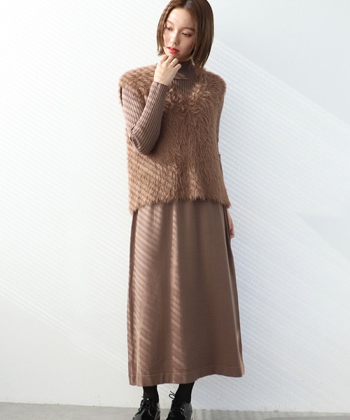 別々でも使える旬顔のニットセットワンピースこれ一着で決まる、トレンドのブラウンカラーのセットアイテム。シャギーベストは肌触りも心地よく柔らかに女性らしさを演出。カジュアルからきれいめまで幅広く着回ししていただけるレイヤードアイテムです。ニットワンピースは身頃部分はリブニットですっきりとさせつつ、スカート部分は少しゆったりとしたリラクシーな着心地。ウエストの高い位置で切替が施されていて脚長効果も期待できます。--------------------------------------透け感:なし裏地:なし伸縮性:ありケア方法:手洗い可※お洗濯の際は洗濯表示を必ずご確認ください。--------------------------------------
