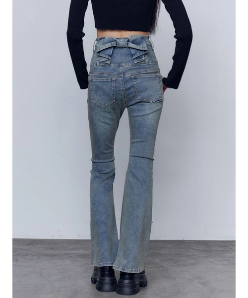 バックスタイルのリボンがポイント! ■デザイン 立体感のあるリボンは構築的で甘さを控えモードなスタイリングにも合わせやすくおすすめです。 しっかりと深さのあるハイウエストは、腰位置を高く脚を綺麗に見せてくれます。 オールシーズン穿いて頂けるデニムストレッチ生地なので、デザインデニムを様々な季節で楽しんで頂ける1着になります。 ■スタイリング バックのリボンがポイントなので、 ハイネッククロップニットのようなショート丈トップスとのスタイリングがイチオシ。 バックのリボンが目線を上にあげてくれるので、ラウンドサイドゴアブーツのような厚底ブーツを合わせるとよりスタイルアップ効果があります。 ※着用画像はフラッシュの加減で実際の製品と色味等が異なる場合がございますので、生地のズームアップ画像をご確認ください。 ※ご利用の端末画面の設定により実際の商品と色味が異なる場合がございます。 【商品特徴】 透け感:なし 伸縮性:ややあり 生地の厚さ:普通 サイズ感:普通 裏地:なし ポケット:あり(前/後) 春服