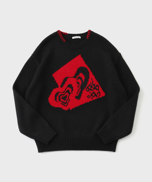 アクリル×コットン素材のプルオーバーニット。それぞれ『ボーン』と『ハート』をモチーフした書き上げのグラフィックをジャガードで表現しております。素材の特性上、スウェット感覚でカジュアルに着用できる一着です。ワンポイントとしてハンドステッチを施しました。※取り扱いについては、商品についている品質表示にてご確認下さい。※照明の関係により、実際よりも色味が違って見える場合があります。またパソコン・スマートフォンなどの環境により、若干製品と画像のカラーが異なる場合もございます。※商品の色味は、商品アップ画像をご参照ください。本体:手洗い可能
