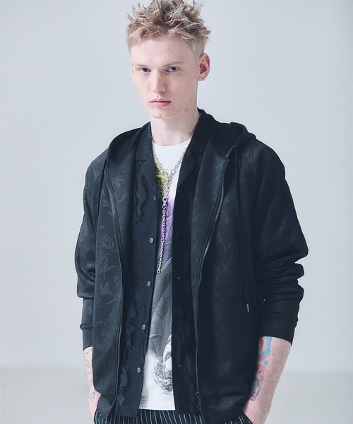 Emboss Leaf Zip Hoodie【素材】レーヨン / ポリエステルのストレッチポンチを使用。そこにリーフ柄のエンボス加工を施したオリジナルテキスタイルです。【デザイン】5351 定番の ZIP フーディー。フードの中心部分と袖山線の肩部分に別素材で 3.5cm巾のラインを施しアクセントにしました。 【コーディネート】単品使いは勿論のこと、同素材ジョグパンツ(品番:02520059072)と合わせたセットアップスタイルがオススメ。