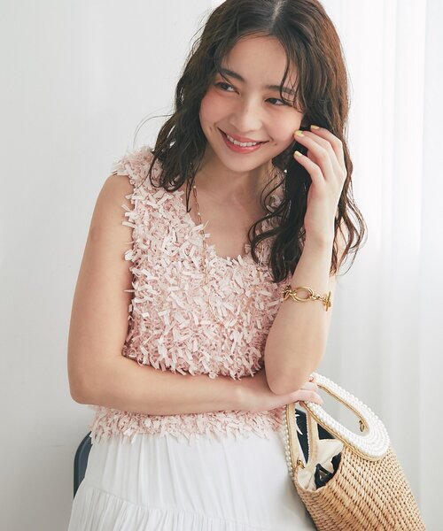 レイヤードにぴったり、2WAYで着回せるテープヤーンベスト ●デザイン 華やぎのあるテープヤーンを使用したニットベスト。 ほんのり透け感のある、表情豊かな編地に仕上げています。 前後2WAYで着用できるネックラインに、 コンパクトなクロップド丈でバランスよく着こなせます。 春らしい明るいカラーで、デニムなどのカジュアルボトムとも好相性。 一枚着はもちろん、シアーインナーやタイトなカットソーとの レイヤードも楽しめるアイテムです。 ※同素材のカーディガンのご用意もございます。 ・テープヤーン前後2WAYカーディガン(LBZ1061105A0005) ●ポイント ・華やぎのあるテープヤーン素材 ・気分で着回せる前後2WAY仕様 ・短め丈でワンピースやスカートとも好相性 ・インナー次第で季節を問わずロングシーズン活躍 ●おすすめのコーディネート シャツやカットソーにレイヤードして、旬なバランスの大人カジュアルに。 ワンピースに重ねると一気にこなれた印象になり、春先の着こなしにもぴったり。 デニム合わせでカジュアルに着こなすのもおすすめです。 洗濯方法:ドライクリーニング 透け感:ややあり 光沢:なし 裏地:なし 生地の厚さ:普通 伸縮性:ややあり #cate001