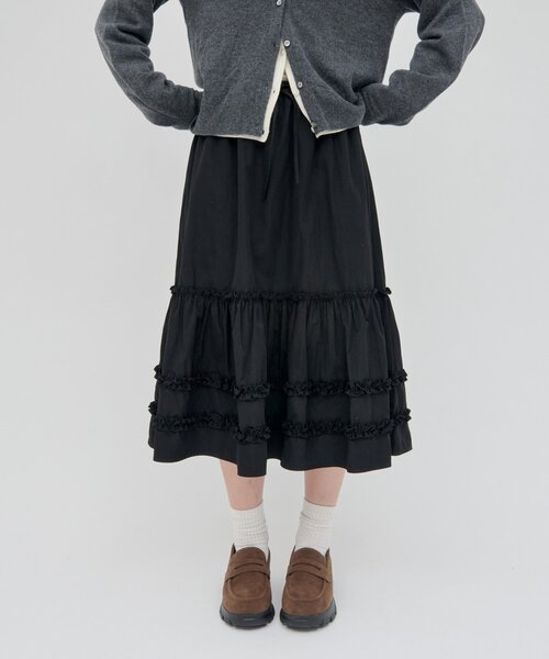 さりげない甘さが、ちょうどいい。 ティアードミドルスカート ・シンプルなトップスを合わせるだけで、スタイリングが完成する主役級デザイン ・段切り替えのティアードデザインが、自然な立体感と動きをプラス ・裾に向かって広がるラインが、腰まわりをすっきりと見せつつ、自然な体型カバーを叶えます ・ウエストは総ゴム×紐仕様で、窮屈感なく自分に合ったフィット感で着用可能 ※ネイビーはWEB限定カラーです。 ●スタイリング ・ニットやスウェットと合わせて、甘さを抑えた大人カジュアルに ・コンパクトなトップスと合わせると、バランスよくスタイルアップ◎ ・デニムパンツやスラックスとのレイヤードスタイルもおすすめ ・足元はブーツやローファーで引き締めると、甘くなりすぎず大人っぽい印象に ●おすすめのスタイリングアイテム ▶【ユニセックス】求心柄オーバーニット ▶【@a_min1203企画】リブカットUネックロンT《WEB限定》 ▶【umm.】WEB限定パイピングボアジャケット ▶ウールカシミアクルーネックカーディガン *********************** 洗濯方法:洗濯機洗い 裏地:あり 透け感:なし 伸縮性:なし 光沢感:なし 生地の厚さ:普通 *********************** ●STAFF着用コメント 149cmスタッフ:腰まわりはすっきりとした印象で、低身長でも全体のバランスが取りやすいデザインです。 157cmスタッフ:ふくらはぎが半分くらい隠れるミドル丈で、普段使いしやすい長さ。動くたびにふんわり揺れるシルエットがかわいいです♡ 163cmスタッフ:カジュアルにもフェミニンにも合わせやすいです。デニムやスラックスとのレイヤードアイテムとしても楽しめます♪ 【お取り扱いの注意】 ※着用時、洗濯時は必ず取り扱い表示・タグをご確認の上、お取り扱いください。 ・洗濯機洗い30℃まで可能 ・洗濯ネットを使用してください。 ・濃色製品は、色移りすることがありますので、他のものと分けて洗濯してください。 ・蛍光増白剤入り洗剤を使用しないでください。 ・長時間水に浸けておいたり、濡れたままにしないでください。 ・アイロン:低温120℃まで(アイロンの際は、当て布をしてください。) ・濃色の場合は、汗や雨などで濡れた状態や強い摩擦等で他の製品に色移りする可能性がありますのでご注意ください。 ・激しい運動や極度な力が加われば、縫い目が開いたり、目寄れ(織り糸が滑り目が開く)する性質があります。 ・この商品は、強い日光(または照明)を長時間受けますと変色の恐れがありますので、ご着用及び保管の際には、ご注意ください。 【カラー表記について】 システム上の都合により、一部カラー名がサイト表記と異なる場合がございます。 【入荷時期について】 入荷日ごとに販売数量が決まっているため、オンラインでは完売後に次期納期の数量にて予約販売を行っております。 店舗入荷時期と予約商品のお届け時期が異なる場合がございますので、予めご了承ください。 ※追加入荷のある商品もございますので、詳しい店舗入荷時期に関しましてはお近くの店舗へお問い合わせください。 ※店舗の在庫状況に関しましては、こちらのページに記載されている「店舗在庫」から確認にしていただけます。 「在庫あり」の表記でも、お取り置き分などでお客様に販売できない場合がございます。 ※予約商品でも、店舗では追加がない場合もございます。ご了承ください。