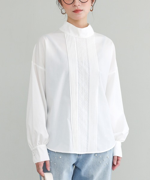 繊細レースが叶える、清楚な佇まい。 繊細なレースとピンタックが上品で絵になる一枚。 きれいめにもカジュアルにも使え、幅広い着回しが叶います。 ●POINT ゆとりのあるスタンドカラーと後ろボタンが大人の抜け感をプラス。 さりげなく開いた後ろ襟元が、品よく女性らしい印象に。 程よいゆとりと丈感で気になる腰回りを回りをさり気なくカバーしつつ、 ジャケットなどの羽織ともバランスよく合わせられるシルエットです。 シワになりにくく、とろんとした落ち感が心地良い肌触り。 動きに合わせてしなやかに揺れるのが魅力の一枚です。 重ね着次第でロングシーズンにご着用いただけます。 【size 1/2】 着丈:64cm/67cm 肩幅:63cm/67cm アームホール:40cm/44cm 袖丈:49cm/50cm 袖口周り:20cm/24cm バスト:108cm/120cm 裾周り:114cm/126cm ■製品についての注意書き 染色の特質上、発汗や摩擦により色落ちすることがありますのでご注意ください。 また、着用中の摩擦により色移りしやすい特性がありますので、白や淡色との組合わせはご遠慮ください。 他の製品に色が移ることがありますので、一緒に洗わず単独で洗ってください。 ご了承の上、ご購入いただきますようお願いいたします。 ....................................................................................... n'OrLABEL ほかにない、私のデイリーウェア 毎日の生活を心地よく自分らしく過ごすための服。 遊び心を取り入れた、大人のカジュアルスタイル。 .......................................................................................