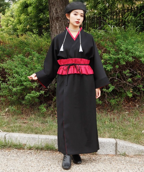 衿元や袖口、帯や前裾内側に流水をモチーフにした模様が織り込まれたジャカード生地を使用。一枚で着物のようなスタイリングが愉しめるワンピース。動くたびに前の八掛(はっかけ、隠れたお洒落)部分の生地がちらりと見える上品な仕立て。帯部分は整えやすい仕様で、ケアもしやすいポリエステル生地のワンピース。晴れ着としてもご着用いただけます。大人な和モダンスタイルに。・両サイドポケット付き。◆カヤ◆古くから伝わる日本の伝統と新しい文化の融合。「新しいカタチの日本」に出会える倭物ブランド【カヤ】「文明開化」をテーマに、倭モダンで色彩あふれる刺激的な和雑貨を提案していきます。※こちらの商品は1点1点職人による手作りとなります。その為、形や色合いなど若干異なる場合がございます。あらかじめご了承ください。※屋外での撮影画像は、光の当たり具合で色味・カラーが違って見える場合がございます。商品のカラーは、スタジオ撮影の画像をご参照ください。Amina Collection Co.,LTD.
