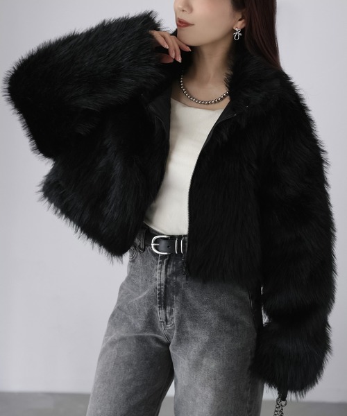 【Riberry ショート丈ダブルジップフェイクファーブルゾン】\ボリュームはそのまま、丈感は今っぽく/ショート丈でスタイルアップが叶うフェイクファーブルゾン♪■StylingRiberryで人気の【RE-0043】ダブルジップフェイクファーブルゾンをベースに、今っぽさを意識したコンパクトなショート丈にアップデートしたファーコートが登場しました。ボリューム感のあるフェイクファーはそのままに、重く見えがちな冬のスタイリングをバランス良く仕上げてくれる一着です。毛足の長いフェイクファー素材は、リアルファーのような表情と柔らかさを兼ね備え、軽やかな着心地ながらしっかりと存在感のある仕上がりに。フロントはダブルジップ仕様で、上だけ閉めてスタンドカラー風に、上下を少し開けて抜け感のある着こなしにと、その日の気分やコーデに合わせて表情を変えられます。首元まで暖かく包み込むデザインで、防寒性も◎。ショート丈なので、ハイウエストボトムやワイドパンツ、ロングスカートとも相性抜群!デニム合わせでカジュアルダウンしたり、ワンピースの上に羽織って女性らしくまとめるのもおすすめです。コンパクトな丈感が、自然とスタイルアップも叶えてくれます♪存在感がありながらも主張しすぎず、デイリーからお出かけまで幅広く活躍するフェイクファーブルゾン。羽織るだけで冬のスタイリングが完成する、Riberryらしいバランスのとれたイマドキな一着です!■Detail程よくゆとりのあるシルエットで、厚手のニットやスウェットの上からでも羽織りやすく、真冬の防寒アウターとしても活躍。首元のホックを留めるとスタンドネックにもなる仕様で首元も暖かいです!両サイドにはポケット付きで、実用性も◎ショート丈なので重くなりすぎず、どんなボトムともバランスよく着用いただけます♪■Materialポリエステル100%の柔らかくしっとりとしたフェイクファーを使用。毛足の長目で手触りよく、お手入れしやすい素材です◎軽やかでありながらもしっかりと暖かさを感じられ、長時間着ても疲れにくいのが嬉しいポイント!デイリーに気軽に羽織れるのブルゾンです♪▽生地感透け感:あり 〇〇〇〇●なし生地の厚さ:厚い 〇〇●〇〇 薄い裏地:あり伸縮性:なし※この製品は素材の特性上、着用時の摩擦等により毛が抜けることがございます。着用の際、他の衣類に毛羽がつくことがあります。その場合は粘着テープ等で軽く押さえるなどして取り除いてください。※商品の梱包には細心の注意を払っていますが、通販の特性上、到着時に畳みシワがついている可能性がございます。予めご了承ください※この素材は摩擦(特に湿った状態での摩擦)や雨、汗でぬれた際には他の衣料等に色が移ることがございますのでご注意ください。※お肌のデリケートな方は刺激を感じる場合がございます。※詳しいお手入れ方法は商品タグをご参照ください。【Information】◆《お気に入り登録》がオススメ◆・「商品のお気に入り登録」で再入荷通知や、ラストの通知、セール通知も受け取ることが出来ます。・「ブランドのお気に入り登録」で新商品や再入荷など、お得な情報を受け取ることが出来ます※撮影時のライティング、ご覧になっているモニター・PC環境により、実際の商品と色味が異なって見える場合がございます。予めご了承をお願い致します。