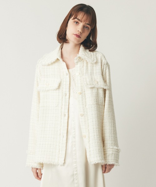 【Design & Fabric】 大きめの衿デザインが可愛いシャツディティ―ルのツイードジャケット。 特別感のあるファンシーツイードが、羽織るだけで華やかに魅せてくれます。 切替え部分に施したフリンジデザインがポイント◎ ツイード素材にマッチするボリューム感のある貝釦でアクセントをプラスしました。 スカートとのセットアップはもちろん、単品でもコーディネートが楽しめます。 テープヤーンやラメ糸など、様々な意匠糸が贅沢に織り込まれた日本製のファンシーツイード。 軽くて柔らかい風合いも魅力です。 透け感:無し 裏地:ヨーク裏、袖裏のみあり 伸縮性:なし 光沢感:ややあり(ラメ感) 《ライトベージュ》 Model:H176cm B82cm W59cm H88cm 《オフホワイト》 Model:H177cm B78cm W58cm H88cm