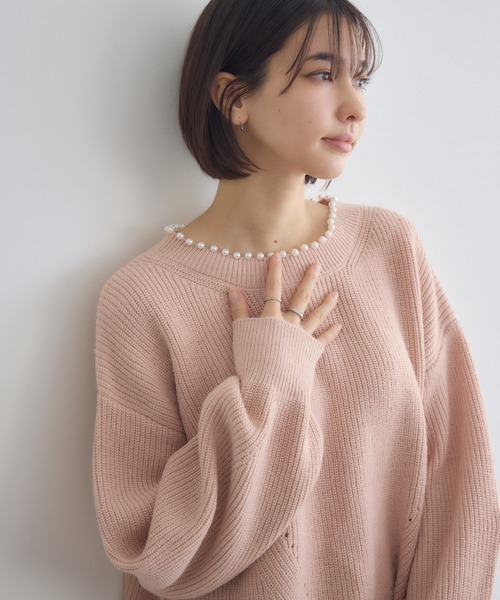 【KATHARINE ROSSオリジナル】華やかなパール衿で上品さ際立つ、畦編み7Gプルオーバー[素材]・程よく肉厚で温かみがあり、肌触りはなめらかで快適。・畦編みの立体感が表情豊かで、着るだけで上品な印象に。[デザイン]・首元にぐるりと施されたパールが、顔まわりを華やかにしてくれます。・一枚で着ても上品さと存在感をプラスし、アクセサリーなしでも洗練された印象に。・程よく膨らんだボリューム袖が、女性らしい柔らかさを演出。・後ろの丈を少し長めにデザインし、両裾にはスリットを施すことで、パンツやスカートとのレイヤードも美しく決まります。[スタイリング]・フレアスカートと合わせて、女性らしい柔らかさのある休日コーデに。・デニムと合わせて、大人カジュアルながらも首元のパールで華やかさを演出。■光沢感:なし■透け感:なし■伸縮性:あり■生地の厚さ:やや厚手※照明や光の当たり具合で色味が違って見える場合があります。※システムの都合上、店舗より入荷が遅れる場合がございます。