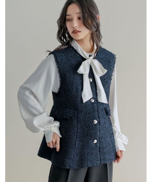 柔らかく、上品に。進化したペプラムツイード ▼デザイン 表情豊かなファンシーツイードを使用したペプラムベスト。 異なる太さや素材感の糸が織りなす立体感が、シンプルなコーディネートにも華やぎをプラスしてくれます。 マットな艶消しシルバーボタンが甘さを抑え、女性らしい洗練された印象に仕上げました。 裾に向かってふんわりと広がるペプラムシルエットが、自然なスタイルアップ効果を叶えます。 柔らかな生地感のため身体に自然になじみ、快適な着心地もポイント。 オケージョンなど特別なシーンにあわせたシックな装いから、カジュアルダウンしたミックススタイルまで幅広い着こなしが楽しめる1着です。 ▼コーディネート とろみ素材のブラウスやボウタイシャツを合わせて、トレンド感のあるセレモニースタイルが完成。 デニムやホワイトのワイドパンツを合わせれば、きれいめなお出かけスタイルにもぴったりです。 ▼素材 フリンジ加工を施したさらりとしたツイード生地 ▼お取り扱いについて ※この製品は摩擦(特に湿った状態での摩擦)や、汗や雨などで濡れた際に、他の衣類や下着(特に白)等に色移りする場合がありますので十分にご注意ください。 ※色移りした場合は、速やかに洗濯またはクリーニングに出してください。 ※洗濯やクリーニングの際、多少色落ちすることがありますので、単品洗い、単品クリーニングしてください。洗剤の量が多いと、色落ちの度合いが高くなりますのでご注意ください。 ※速やかに脱水、乾燥をしていただけますようお願いいたします。 ■モデル着用写真は撮影環境により、 多少実際のカラーと異なる場合がございます。 お気に入りショップにご登録いただきますと、 ショップニュースを、いち早くお届けいたします。