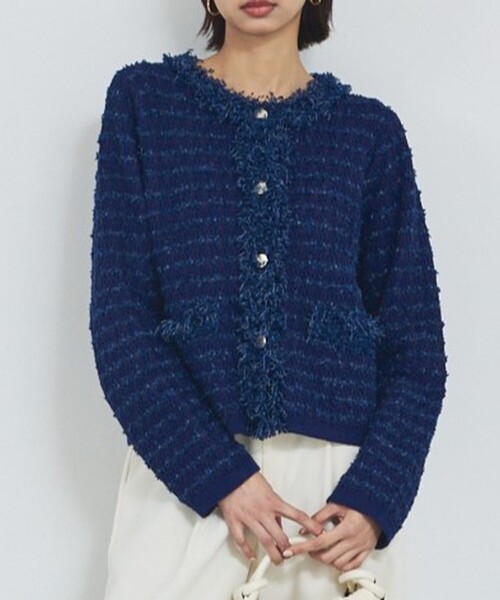 華やかなツイードを気軽に着こなせる 【Design】 柔らかく着心地の良いジャケット風ニットカーディガン。端のフリンジが華やかなツイード織りと、ノーカラーでジャケットとしての存在感をちゃんともつ1着。トレンドのコンパクトタイプ、でも実は素材がニットなのでトップス感覚で楽に着れちゃう嬉しい女子アイテムです。スタイリング次第でカジュアルからオケージョンまで幅広く活躍します。 【Fabric】 優しく編まれたツイード調ニット。とても柔らかく伸縮性もあるので、中にシャツを重ねたりも出来ます。 【Styling】 デニムと合わせてカジュアルに着こなすのも今の気分。同系色の綺麗目ボトムスと合わせればセレモニーシーンやオフィスにも◎ ********************** 透け感:なし 裏地:なし 伸縮性:あり 光沢感:なし 生地の厚さ:普通 **********************