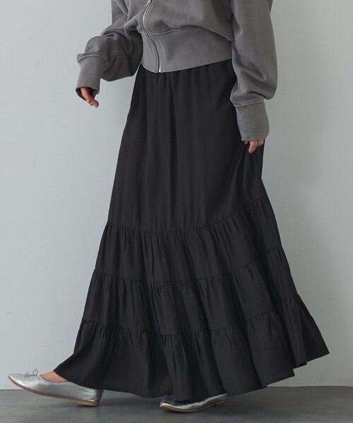 女心を掴むたっぷり揺れるティアード【Design】贅沢な揺れ感が魅力のティアードスカート。春の訪れを感じさせる、この上なくキュートに決まるアイテムです。旬なメンズライクアイテムに合わせれば間違いないスタイリングに。デニムやお好きなボトムにレイヤードしてつかるよう裏地はペチコートとして分離しています。ウエストゴムで着脱も楽ちん。軽い履き心地なのでシーズンレスで着用出来ます。【Fabric】コットン見えですが、お手入れやシワが気にならない化繊の生地を使用しています。【Styling】コンパクトなトップスに合わせてスタイルアップ効果を狙うのも◎オーバーサイズのスウェットや、ジャケット合わせで甘辛MIXコーデも鉄板。**********************透け感:ややあり裏地:あり伸縮性:なし光沢感:なし生地の厚さ:やや薄手**********************