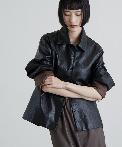 《 Lui's FEMME(ルイス ファム)オリジナル26SSコレクション 》フェイクレザーシャツジャケット●デザイン程よ艶感のフェイクレザーを使用したシャツ。肩はジャストめで身幅はややゆとりあるサイズ感のため、マニッシュなムードとリラックス感を兼ね備えたアイテム。シャツとしてもアウターとしても楽しめる一着です。●素材しなやかで程よい厚みのある合成皮革。高級感抜群なしぼ感が特徴的。●スタイリングバランスのとりやすい一着なので、ボトムス問わずコーデに取り入れていただけます。インナーにタートルネックを入れたキレイめモードなスタイリングはもちろん、スラックスにベルトを締めたスタイリングにバサっと羽織ったコーデも雰囲気ありおススメ。**********************透け感:なし裏地:あり伸縮性:なし光沢感:あり生地の厚さ:普通**********************【ブランド】Lui's FEMME(ルイス ファム)凛とした芯のある女性。 自立した、女性のワードローブをイメージ。洗練されたかっこよさの中に、女性らしさ・かわいさ・セクシーさを持つ。自分自身のスタイル(自分らしさ・個性・生き方・感覚...)を表現できるひとつの手段としての服。肩肘張らない、心地よいリラックス感のあるスタイルを上質な素材、優雅なシルエットで提案。 《商品画像について》ご覧頂いている商品の写真につきましては、できるだけ実物の色に近くなるように努めておりますが、お使いの環境(モニター、ブラウザ等)の違いにより、色の見え方が実物と若干異なる場合がございます。 予めご了承ください。《予約商品について》・こちらの商品はサンプルでの撮影・計測となっております。実際の商品とは、商品の一部仕様が変更になる場合がございます。・撮影サンプル品はブランドタグがついておりません。製品にはタグがつきますので、製品の表に縫い糸が見えたり、着用時にタグが透ける場合がございます。・サンプルの為、混率の詳細が確定しておりません。確定次第、記載いたします。・工場の生産の都合上、納期が変更になる場合がございます。発送日の前後についてはあらかじめご了承ください。・入荷状況により、お客様への発送が店頭販売より遅れる場合もございます。・店頭に陳列していた商品も含まれる場合がございます。《ハートをタップして商品のお気に入り登録》登録カラーの商品の「残りわずか」「再入荷」「値下げ」通知を受け取ることができます。各ショップアプリにてブランドフォロー 新商品などの入荷情報、最新のニュースやお得な情報を受け取ることができます。