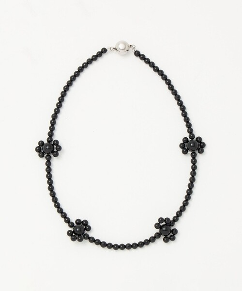 深みのあるブラックオニキスを贅沢に使用した2WAY仕様のネックレス。フラワーモチーフをリズミカルに並べたチョーカー。ネックレスだけでなく二重に巻いてブレスレットとしてもお使いいただけます。丸い留め具はワンタッチで簡単に着脱可能、スムーズに留められる実用性とミニマルさを兼ね備えてます。オニキスの石意味ブラックオニキス(Black Onyx)は、深い黒の輝きを持つ天然石で、古来より「守護」と「意志の強さ」を象徴するといわれています。ファッションだけでなく、お守り石としても人気があります。■ メーカー品番:IN-197<in mood(インムード)>その時々の”気分で”様々なスタイルを楽しむ大人の女性に向けてのブランド。「リアルクローズに合わせられる品のあるアイテム」in moodのアイテムをMIXすることにより、リアルクローズでありながら華のあるスタイルを目指しています。「ファッション好きな女性が、毎シーズン好みのアイテムを買えるように」という思いから、主に真鍮などを素材として使用することで手の届く価格帯を実現しています。【注意事項】※商品に「取り扱い上の注意書き」、「洗濯表示」がございます場合は、使用前に必ずご確認ください。※商品画像は、光の当たり具合やパソコンなどの閲覧環境により、実際の色味と異なって見える場合がございます。あらかじめご了承ください。※商品の色味の目安は、商品単体の画像をご参照ください。※天然素材を使用しております。大きさ形色に個体差があります。内包物や表面に凸凹、着色、傷などがございます。素材の特性で不良ではございませんので予めご了承ください。店舗へお問い合わせの際は、全国のASTRAET各店舗まで下記の品名/品番をお申し付けください。品名:IM ONYX FLOWER N/LACE 品番:54335000158