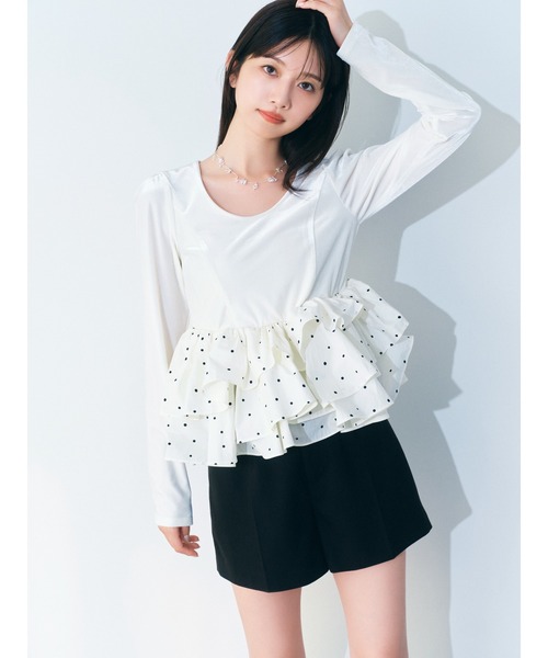 【異素材ドッキングが映えるペプラムトップス】【Design/Styling】異素材のコンビネーションで表情豊かに仕上げたペプラムトップス。身頃にはストレッチ性のあるベロア素材を使用し、フィット感のあるシルエットに。ペプラム部分には張り感のある素材を切り替え、立体的で華やかなボリュームを演出しました。アシンメトリーのデザインで動きを持たせ、モードな印象もプラス。コンパクトなサイズ感でデニムパンツと合わせれば、バランスの取れたスタイリングが完成します。一枚で主役になる存在感のあるアイテムです。【Fabric】伸縮性に優れたベロア素材と、張り感のある素材をドッキング。異素材のコントラストが引き立ち、立体的なシルエットを美しく表現します。※照明の関係により、実際よりも色味が違って見える場合があります。またパソコン・スマートフォンなどの環境により、若干製品と画像のカラーが異なる場合もございます。予めご了承ください。商品の色味は、商品単品画像をご参照下さい。※商品画像はサンプルのため、色味やサイズ等の仕様に変更がある場合がございますので、予めご了承ください。