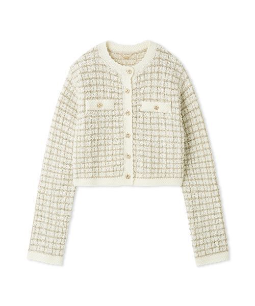 【華やかなツイード調が映えるニットカーディガン】【Design/Styling】表情豊かな3種類の糸をミックスし、華やかな印象に仕上げたツイードニットカーディガン。フラッグヤーンやラメ糸を引き揃えることで奥行きのあるツイード調を表現しました。ボディはコンパクトなシルエットで、きちんと感を演出しながらも女性らしい佇まいに。トリム部分には柄編みを取り入れ、細部にまでリュクスなこだわりをプラスしました。煌めくヴィンテージライクなゴールドボタンがアクセントとなり、着映え力を高めます。同シリーズのビスチェ(LWNT261015)やパンツ(LWNP261016)とのセットアップスタイルもおすすめです。【Fabric】フラッグヤーンやラメ糸の3種類の糸をミックスした編地を使用。華やかな煌めきとツイード調の奥行きある表情を楽しめる素材感です。※照明の関係により、実際よりも色味が違って見える場合があります。またパソコン・スマートフォンなどの環境により、若干製品と画像のカラーが異なる場合もございます。予めご了承ください。商品の色味は、商品単品画像をご参照下さい。※商品画像はサンプルのため、色味やサイズ等の仕様に変更がある場合がございますので、予めご了承ください。