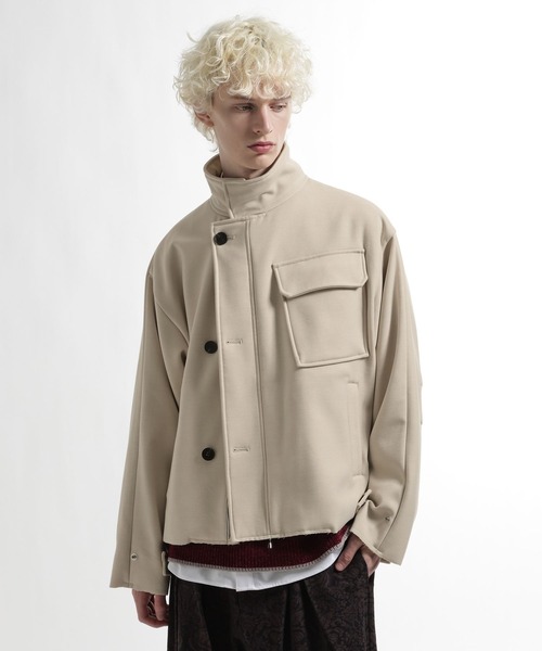 ーーーミリタリーデザインをミニマルに昇華した、構築的なスタンドブルゾン。ーーーDESIGNミリタリージャケットをベースにしながらも、装飾を削ぎ落とし、ミニマルかつモードなブルゾンへと再構築。高めに設定されたスタンドネックに、アシンメトリーに配置されたフロントボタンが、エッジとアクセントを加えます。胸ポケットや袖の切り替えなど、さりげない立体ディテールが構築的な印象を与えます。ゆとりを持たせたボックスシルエットで、リラックス感と旬なムードを演出。MATERIAL表側は起毛感のある素材を使用し、温かみのあるメルトンのような雰囲気。冬の寒い時期にも快適に着用いただけます。ボンディング加工により、ハリとコシが生まれ、ブルゾンの構築的なシルエットを美しくキープします。