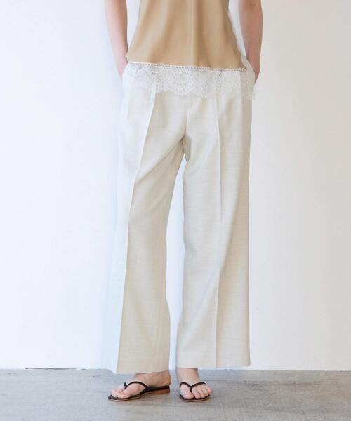 ≪デザインポイント≫ 2タックのストレートシルエット。ややワイドなシルエットになっています。日本のパンツ工場で丁寧に縫製されたこだわりの1本です。 ≪素材・着心地≫ ポルトガルのRIOPELE社のバスケット素材を使用。春の新しい提案です。上品な光沢感、自然なスラブ感が高級感のある表情を演出しています。 ≪おすすめの着こなし≫ フェミニンなブラウス合わせでもしまったスタイリングに。Tシャツやスニーカーきちんと感のある着こなしに。 透け感:なし 伸縮性:なし 光沢感:ややあり 裏地:なし 生地の厚さ:普通
