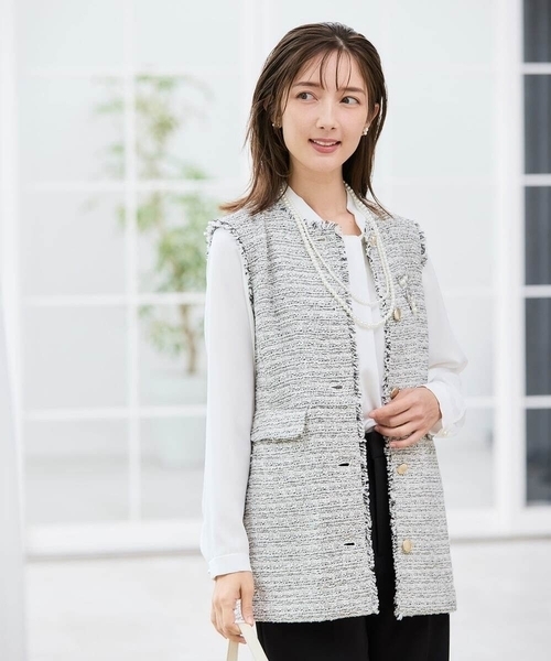 ◆通勤にもOK、入学式・卒業式・七五三・セレモニー◆ 【デザイン】 ・ファンシーツイードが着映えるジレ ・自然なウエストシェイプ&さりげないペプラムシルエットできれいに見える ・腰位置が高く見えてスタイルアップ効果も◎ ・甘すぎないデザインでシャープ派もフェミニン派にもおすすめ ・アイボリーとダークグレーの2色展開 【素材】 ・表面感のある素材 ・高級感のあるファンシーツイード 【コーディネート】 フェミニン派もハンサム派にもおすすめのツイードジレ。 シンプルなブラウス合わせでコーディネートが決まる華やかな一枚。 卒園、卒業や入園、入学などのセレモニーシーン、 七五三や学校行事、発表会などお子様のハレの日にも◎ フォーマルな場やビジネスシーンに活躍します。 ボトムや小物次第でカジュアルにも使えて着回し力の高い一枚です。 XXSサイズ:KAJCD01119 -------------------- 着用シーズン 春:◎ 夏:× 秋:◎ 冬:○ ------------------- 透け感:なし 裏地:あり 伸縮性:なし 光沢感:なし 生地の厚さ:ふつう -------------------- ≪お気に入り登録機能の使い方≫ ■商品のお気に入り登録(ハートマークをクリック) 再入荷通知や値下げ等、お得なご案内を受けることができます。 -------------------- ※商品画像は、光の当たり具合やパソコンなどの閲覧環境により 実際の色味と異なって見える場合がございます。 商品の色味の目安は商品単体の画像をご参照ください。