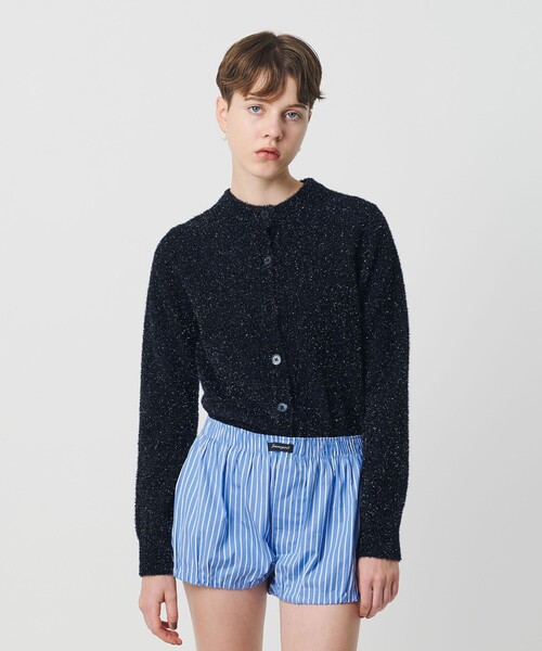 キラキラとしたナイロンのフェザーヤーンで仕立てたカーディガンです。透明感のあるきらめきが、ミニマルなシルエットを華やかに際立たせています。同シリーズのパンツ(対象品番:16141000022)と組み合わせたり、ハードなレザーアイテムとも好相性です。日常のワードローブに寄り添いながら、大人のフェミニティを昇華させるロマンティックな一着。============================裏地:なし透け感:なし光沢感:ありケア方法:ドライクリーニング============================【注意事項】※商品に「取り扱い上の注意書き」、「洗濯表示」がございます場合は、使用前に必ずご確認ください。※商品画像は、光の当たり具合やパソコンなどの閲覧環境により、実際の色味と異なって見える場合がございます。あらかじめご了承ください。※商品の色味の目安は、商品単体の画像をご参照ください。店舗へお問い合わせの際は、下記の品名/品番をお申し付けください。品名:HW NY SPARKLE CGN 品番:16281000011