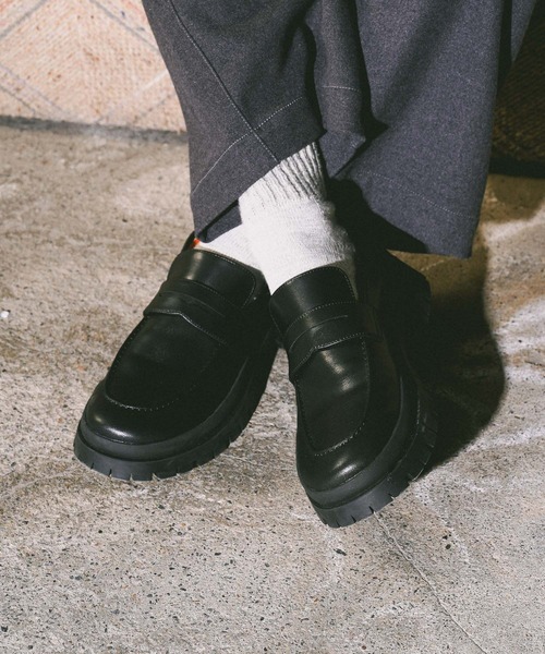 お洒落を叶える高見えフェイクレザーシューズ【デザイン】クラシックなコインローファーに厚底ソールを掛け合わせたトレンド感のあるフェイクレザーシューズ。ボリューミーなソールが足元にさりげないアクセントをプラスし、スタイルアップ効果も◎洗練されたシンプルなデザインなので、カジュアルからドレッシーなスタイルまでオールシーズン活躍するアイテムです。【素材】柔らかく足に馴染みやすいフェイクレザーを使用。マットな質感が上品な雰囲気を演出します。お手入れが簡単で手に取りやすい価格なので一足目の革靴におすすめです。【サイズ】Mサイズ=26~26.5cmLサイズ=27~27.5cm付属している取り外し可能なインソールでフィット感の調整が可能です。※屋外の光や照明の当たり具合で、実際の商品の色味とカラー別画像の色味に違いが発生する場合がございます。商品の色味はスタジオ撮影の詳細画像にてご確認ください。※商品の色や質感を出来るだけ忠実に再現するよう心掛けていますが、実物と若干異なる場合がございます。※写真を許可無くコピー・転用することは固くお断りします。※取扱いアイテムは店舗により異なる場合がございます。