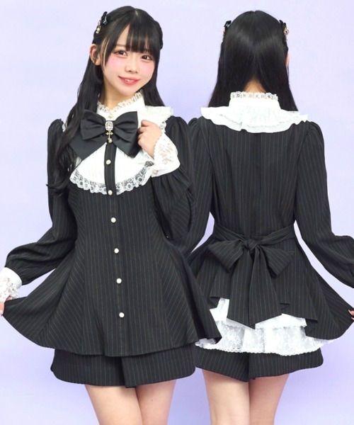 首元のレース×フリルとヨークに映える、ビジュー×クロス付きリボンが存在感抜群♪後ろ姿も可愛く決まるバックリボンと、レースバッスルが魅力です☆