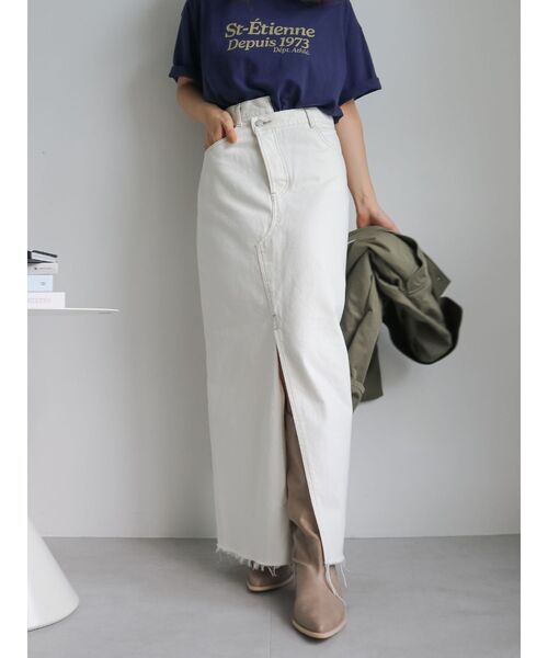 ■デザイン フロントに潔くスリットをいれたアイラインのデニムスカート。座った際にいやらしくならないように、スリット部分はふらし仕様にしており膝下からスリットが開くように設定。ウエストはななめのデザインとなっており、リメイク風の一癖あるデザインがUngridならでは。カジュアルさときれい目な印象のバランスが丁度良いワンウォッシュのブラックと、クリーンな印象で女性らしさのある春にぴったりのオフホワイトの2色展開です。■生地感 ほどよくコシのあるコットン生地を使用。オフホワイトも透けにくい生地感です。■サイズ感 タイトめなサイズ感。ウエストはカーブベルトで、腰回りを包み込むような穿き心地です。■スタイリング Tシャツとのカジュアルな合わせがUngridらしくおすすめ。
