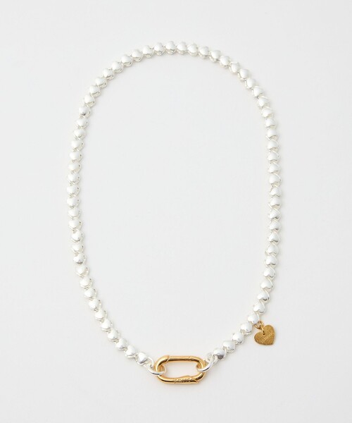 小さなハートが連なったチェーンに、オリジナルデザインのゴールドカラーのカラビナを組み合わせたネックレス。シルバーとゴールドカラーのコントラストが着こなしを引き締めてくれるアイテムです。■メーカー品番:IN-205<in mood(インムード)>その時々の”気分で”様々なスタイルを楽しむ大人の女性に向けてのブランド。「リアルクローズに合わせられる品のあるアイテム」in moodのアイテムをMIXすることにより、リアルクローズでありながら華のあるスタイルを目指しています。「ファッション好きな女性が、毎シーズン好みのアイテムを買えるように」という思いから、主に真鍮などを素材として使用することで手の届く価格帯を実現しています。【注意事項】※商品に「取り扱い上の注意書き」、「洗濯表示」がございます場合は、使用前に必ずご確認ください。※商品画像は、光の当たり具合やパソコンなどの閲覧環境により、実際の色味と異なって見える場合がございます。あらかじめご了承ください。※商品の色味の目安は、商品単体の画像をご参照ください。※金属部の表面に小さな傷、気泡、凹みなどがみられる場合がございますが、加工の特性上発生するものであり、不良品ではございませんので予めご了承ください。店舗へお問い合わせの際は、全国のASTRAET各店舗まで下記の品名/品番をお申し付けください。品名:IM CLIP HEART N/LACE 品番:54335000163