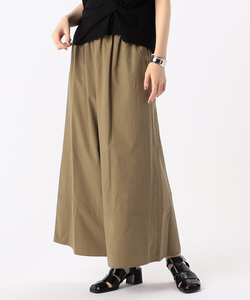 「サラサラとした肌触りのタイプライターのワイドパンツ」《デザイン》スカートのようなエアリーなボリューム感とスピンドルウエストのスポーツ感をミックスしたギャザーワイドパンツです。ギャザーでつくる軽さのあるワイドシルエットです。分量感がありながらもストンとしたシルエットがモードな印象です。クロプト丈が涼やかです。ウエストのスピンドル仕様が新鮮、スポーティーで脇のストッパーがデザインポイントです。ウエストにはゴムを内蔵してその上からスピンドルゴムを通しているので、絞らなくても着用ができます。ディープヘムのような裾切り替えと太いステッチでアクセントをプラスしています。《素材》繰り返し揉み込むタンブラー加工を施したコットンタイプライターです。タンブラー加工を施しています。古くから麻の産地として有名な滋賀県で、その伝統的な麻の加工技術を用い、上質でナチュラルな風合いに仕上げています。タンブラー加工をすることで独特なしわが生まれ、ヴィンテージ感のある表情をつくります。はり感とソフトな風合いを併せ持つ、エアリーな素材感です。綿100%で肌触りが抜群です。お手入れ方法:手洗いOK