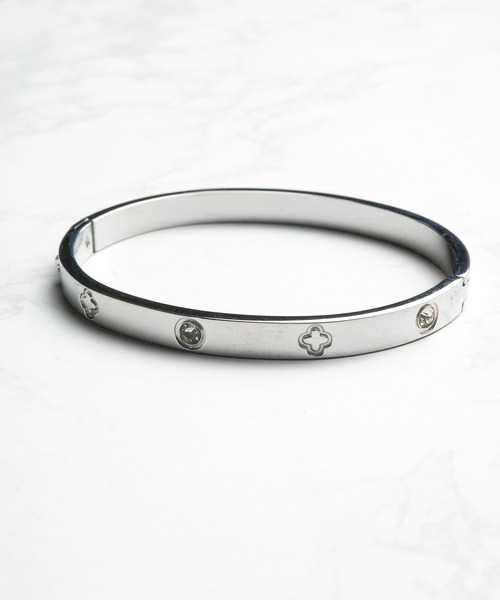 洗練されたミニマルデザインに、さりげない華やかさを添えるクローバーモチーフバングル。艶やかなメタルバングルに、等間隔であしらわれたストーンとクローバーのモチーフが、上品な印象を演出します。無駄のない細身のフォルムは、1本使いはもちろん、時計や他のブレスレットとの重ね付けにも最適。カジュアルからきれいめ、オフィススタイルまで幅広いコーディネートに自然になじみます。クールで洗練されたシルバーと、肌なじみが良く華やかなゴールドの2色展開。デイリー使いはもちろん、ギフトにもおすすめのアイテムです。