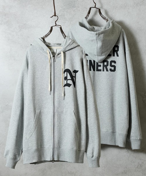 存在感大のグラフィックが目を惹くジップアップパーカー… design … ナンバーナインのスタジャン等で使用していたロゴデザインを採用したフルジップフーディー。前身頃の左胸にはオールド感溢れる“N”ロゴをワンポイント使いし、後ろ身頃にはミリタリーテイストの“NUMBER NINERS”ロゴをプリントしたNEWデザイン。フロントのカンガルーポケットは、スマホやカードケースを入れたり、寒い時には手を入れてアームウォーマー代わりにもなる利便性の高い仕様です。少し大きめのフードにすることで、被った時にもボリューム感のあるサイズにしました。ジッパーは下からも開くことができるダブルジップ仕様で、質感は金属よりも軽いアルミ材質のものを使用することで、生地のライトな雰囲気とマッチしています。… fabric …適度な肉感を持ちつつも通常のスウェットよりも薄手のミニ裏毛素材を使用しています。生地は度詰に編まれているので薄くてもしっかりとハリがある生地感です。コットン特有の柔らかさと肌馴染みの良い触感で、ずっと着ていたくなる肌触りを実現しています。定番で飽きのこない、一年中通して着回しやすい素材です。… size … 適度にゆとりを持たせたリラックス感あるシルエットに設定しました。着丈はややジャストめにしているので、中に長めのタンクトップやレギュラーカラーのシャツなどと合わせたレイヤードスタイルをお楽しみいただけます。春や秋の気候にはTシャツやロンTの上に羽織るアウター代わりとして、冬にはダウンジャケットやMA-1など中綿アウターのインナーとして着られ、夏には冷房対策用として重宝する、オールシーズンご着用いただける一枚です。ステンカラーコートやウールのチェスターコートなど、クラシカルなアイテムと合わせたきれいめカジュアルなスタイルにもおすすめです。※画像はサンプルになります。※洗濯の際に多少の縮みが生じますので、ご了承ください。実際の商品と仕様、加工、サイズが若干異なる場合がございます。