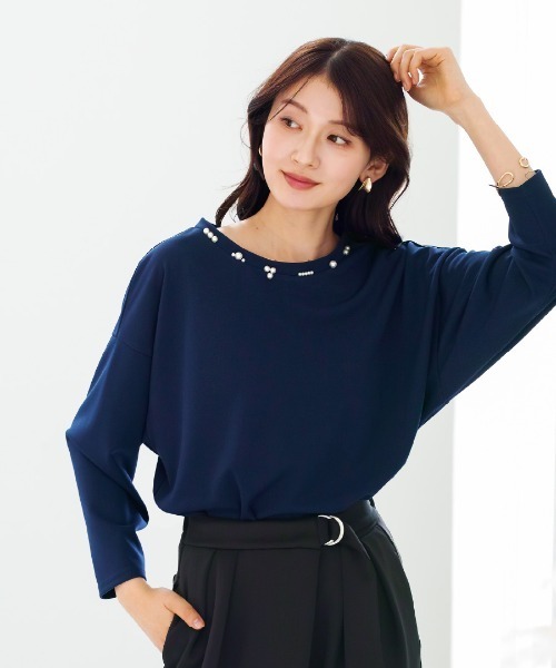 【 ディテール映え 】ドライタッチフライス・ランダムパールライクドルマンブラウス■ White Collection ■「 小粋に華やぐ ランダムパールブラウス 」柔らかさとストレッチ性を兼ね備えたドライタッチフライス素材のパールボタンを施したブラウス。ランダムにあしらわれた大小のパールボタンがネックラインに華やかさと遊び心を添え、まるでアクセサリーを身につけたような印象に。ドルマンスリーブデザインで自然な抜け感と軽やかさを演出。さらに後ろ下がりの裾がヒップまわりをさりげなくカバーします。カジュアルになりすぎず、お家でのイージーケアでオフィスやデイリー、セレモニーまで幅広く活躍します。パンツにもスカートにも合わせやすく、スタイリングに上品なアクセントをプラスする一枚です。【 color 】●アイボリー●ネイビー●ブラック===================厚さ:★★★☆☆透け感:ライトカラーはややあり裏地:なし伸縮性:ありケア:手洗い可シーズン:春・秋・冬===================【 fabric 】ポリエステル91% ポリウレタン9%パール:フェイクパール【 model 】SAKURA 169cm S着用MADE IN CHINA(企画・検品は日本)ランダムパール ブラウス ドライタッチ フライス 手洗い可 ドロップショルダー 後ろ下がり ヒップカバー カジュアル きれいめ レディース 通勤対応 オフィス セレモニー デイリー