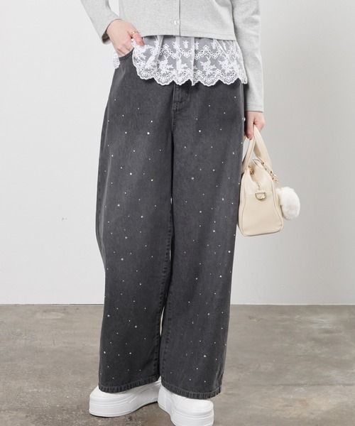 定番デニムを華やかに【デザイン】広がりすぎないワイドシルエットのデニムに、きらきらのラインストーンをちりばめた旬なデザイン。【素材・機能】はき込むほど肌になじみシーズンレスで使える、綿100%のデニム素材。後ろウエストゴムでストレスフリーなはき心地。【スタイル】ショート丈トップス合わせや、タックインスタイルがおすすめ。スウェットなどのカジュアルアイテムからガーリーなブラウスまで幅広いアイテムと好相性。いつものコーデに取り入れるだけでトレンドスタイルが完成♪※後ウエスト部分ゴム※前中心ファスナー開き品番:548-72-1124
