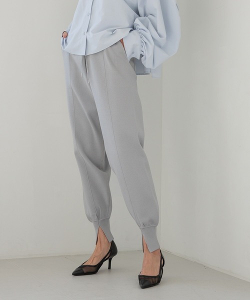 程よくフォルムを出したシルエットが特徴のニットジョグパンツーーー★おすすめポイント★[1]身体にラインが響きにくい中肉ニットJOG[2]スニーカー~ヒールまで幅広く対応[3]裾リブのフロントスリットで足長効果[4]冬~春までの長期着用[5]センターピンタックでキレイ目な印象に。ーーー[fabric] 光沢糸を引きそろえ程よいシャイニー感が個性的な印象。適度な張りと厚みを活かした、身体のラインが表に響かない編地を採用。表面は毛羽立ちもなく、長いシーズン着用可能。[design]センターピンタックが生み出す、すっきり見えのシルエットと、フロントスリット入りの長め裾リブによる足首を長く見せる効果で、スタイルアップが期待できます。シルバーストッパー使いがHEREIAMらしいスポーティーなアクセントになる、リラックス感がありながらも綺麗に穿けるジョグパンツです。[styling]オーバーシルエットのニットやブラウスとの相性はもちろん、短丈トップスでもバランスが取りやすいボリューム感です。ソリッドではなく表面感に印象を出したグリッター見えなので、冬素材のニットトップスと合わせても重くなりません。綺麗めなシャツやブラウス・ジャケットスタイルをカジュアルダウン、スウェットやデニムトップスをカジュアルUPしスタイリングを格上げ。様々なアイテムを中和する、ニュートラルな1本。※屋外での撮影画像は光の加減で実際の商品より明るく見えたり、風合いが異なって見える場合がございます。 商品の色味はスタジオ撮影の画像を参考にして下さい。-------------------------------------≪お買い物をよりお楽しみいただくために≫◆商品のお気に入り登録(ハートマークをクリック)完売カラーの再入荷通知や、完売間近の通知、セールの通知も受けることができます。◆ブランドのお気に入り登録新商品や再入荷など、いち早くブランドのお得な情報を受け取ることができます。-------------------------------------